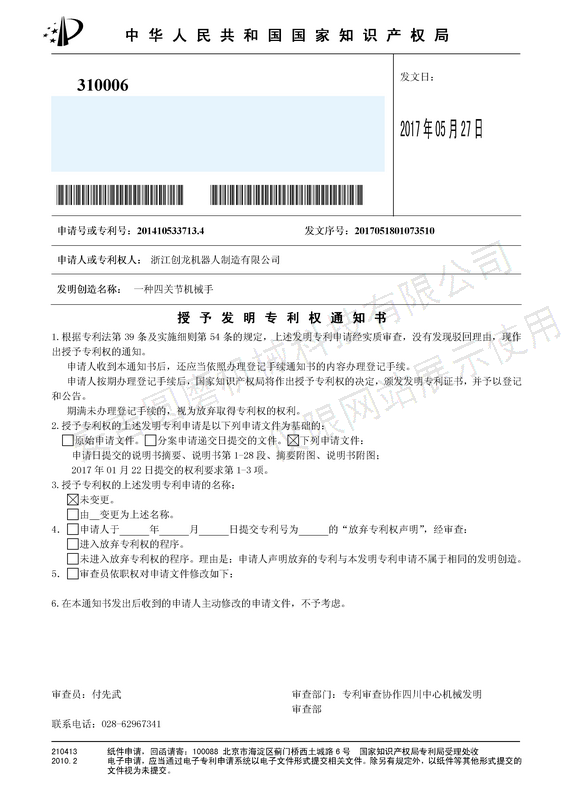 • 发明专利通知书